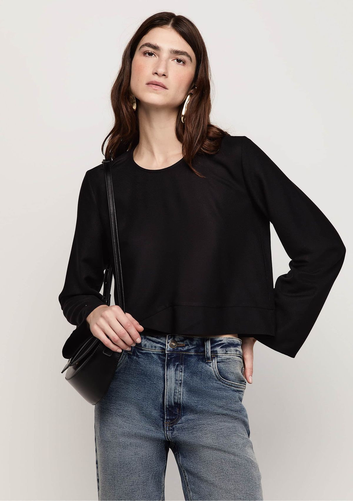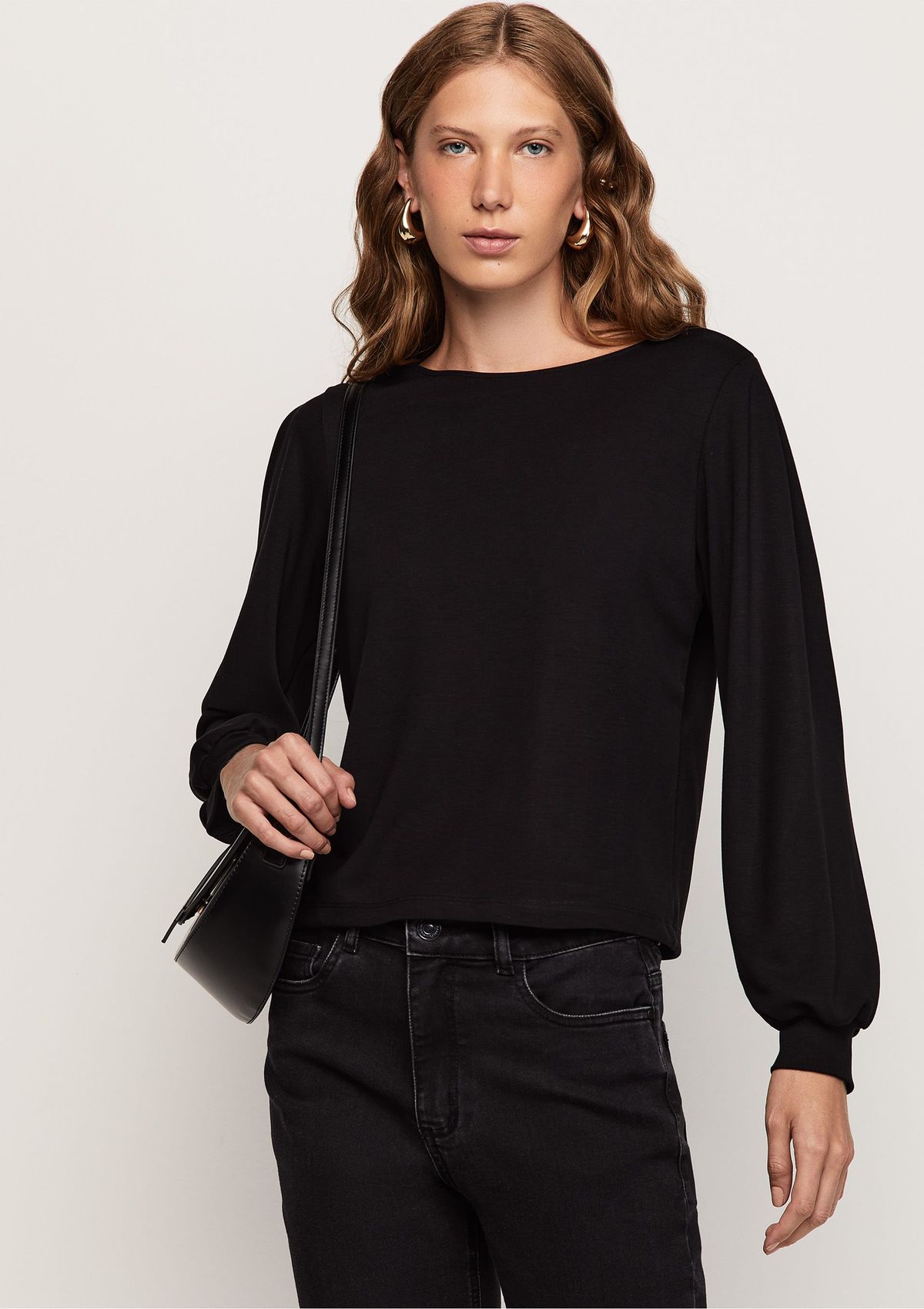 Blusa Reta com Decote Redondo e Sobreposição na Barra - Preto