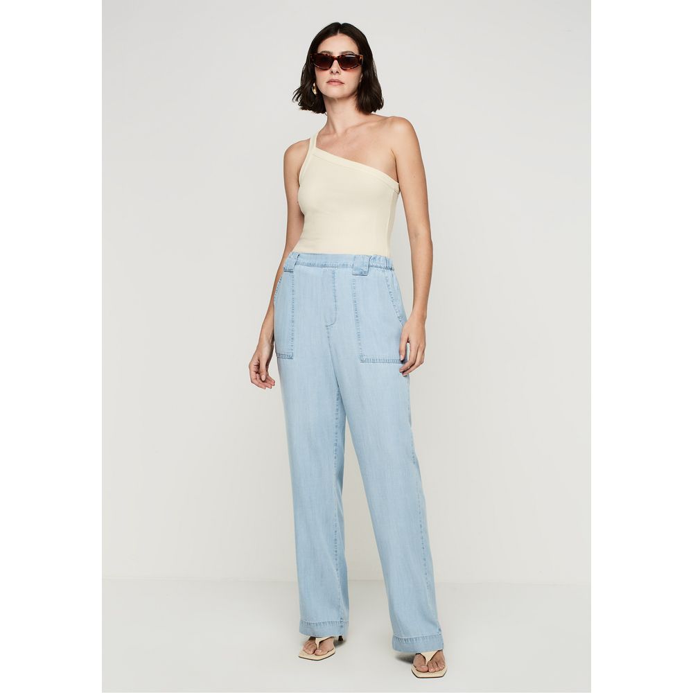 | MEDIDAS | Modelagem reta ampla. Ajustada no quadril e a partir do joelho até a barra tem o corte reto mais solto ao corpo. Possui cintura alta. |