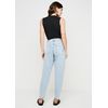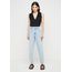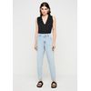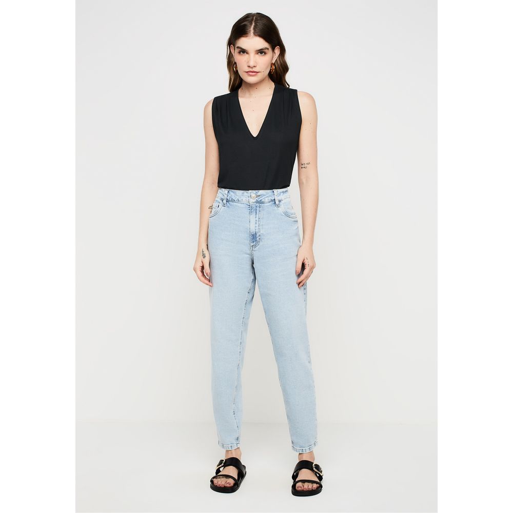 | MEDIDAS | Modelagem mom, inspirada nas calças usadas pelas mães nos anos 80 e 90. Tecido com elastano proporciona conforto extra. Tem a cintura alta, com caimento soltinho nos quadris e coxas, afunilando levemente na barra. |