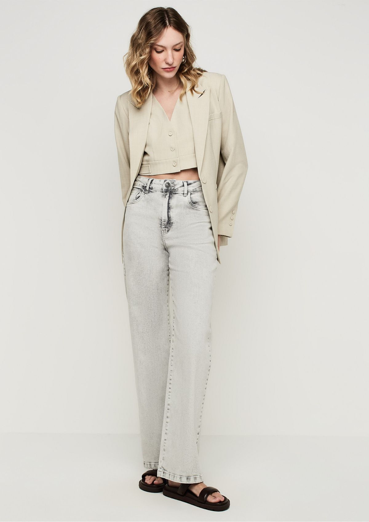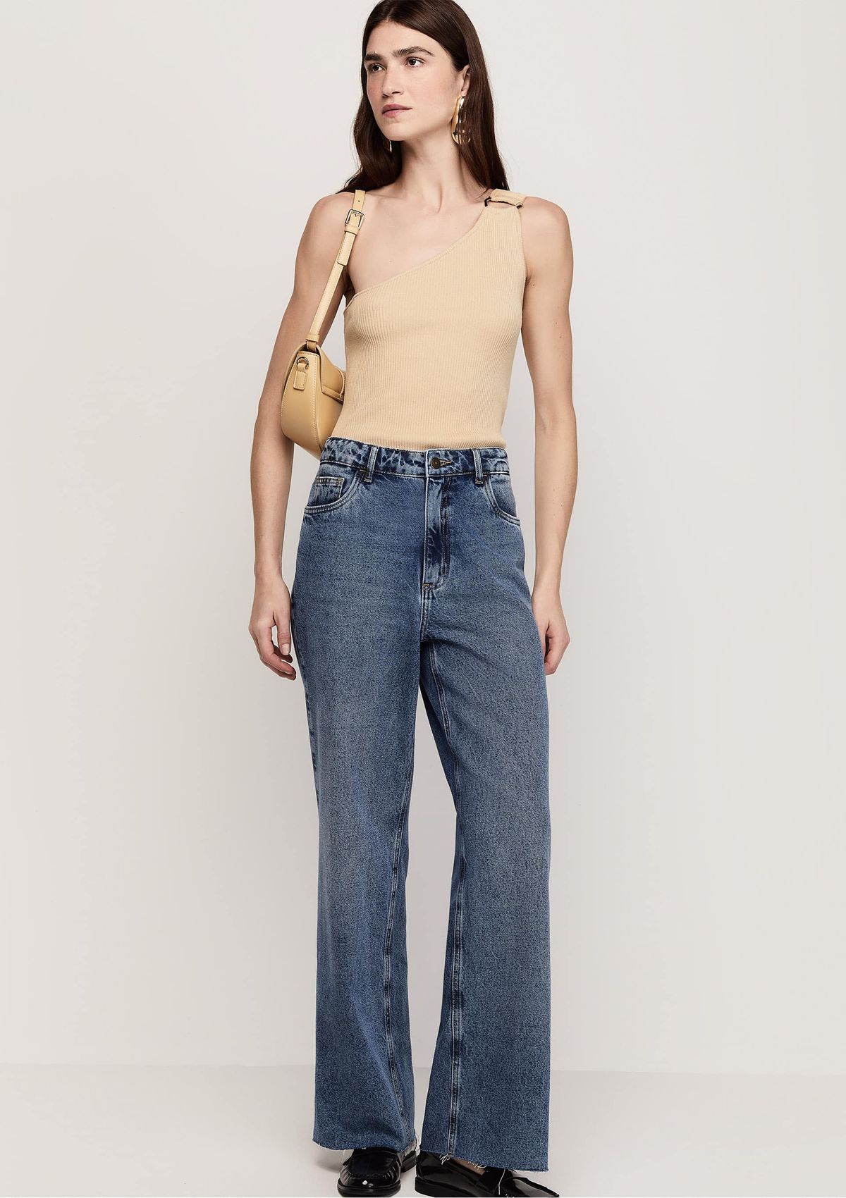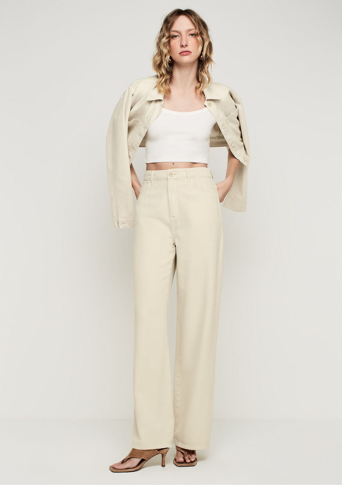 Calça Wide Leg Cintura Alta Em Sarja Com Liocel - Bege