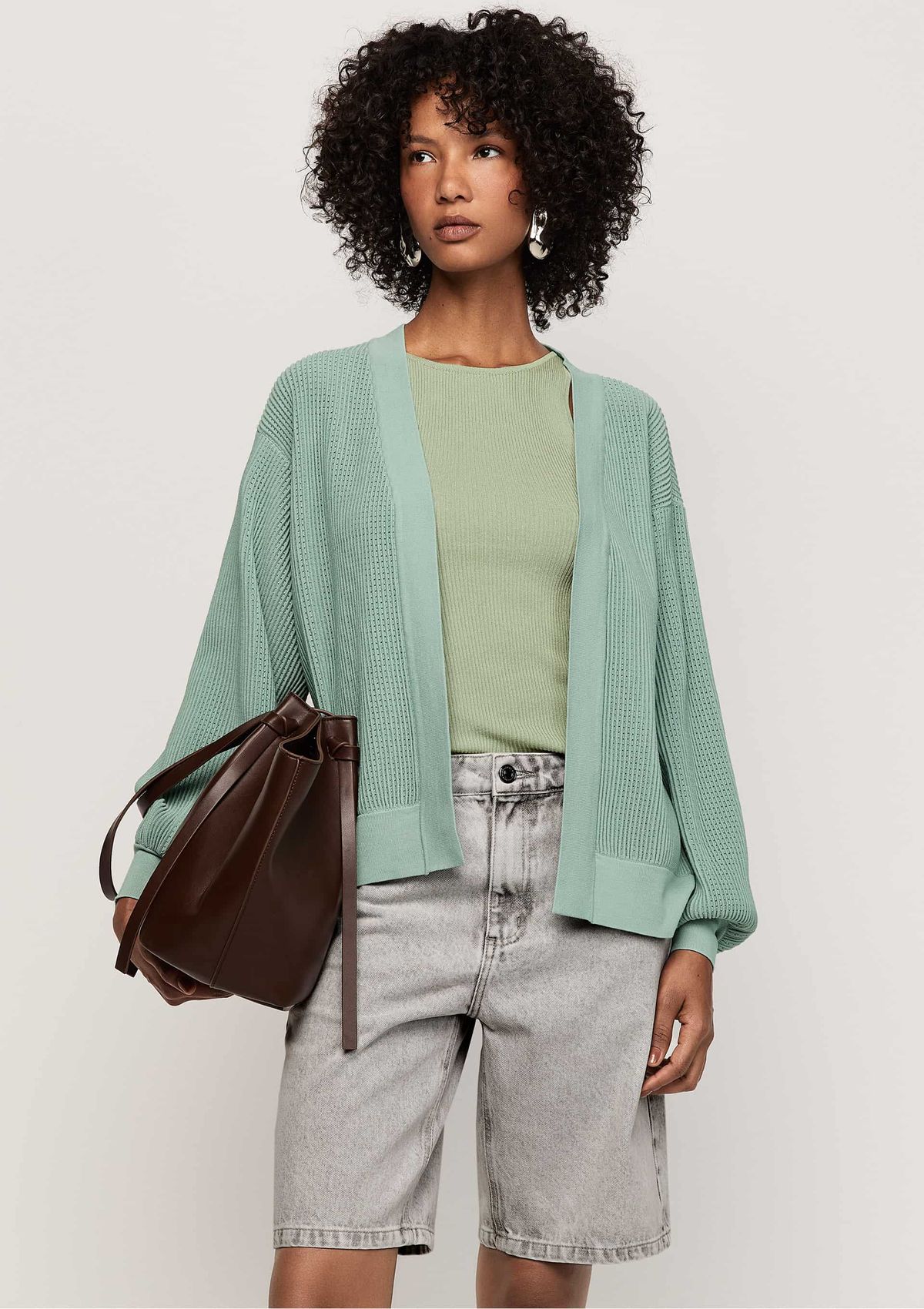 Cardigan Tricô com Manga Bufante - Bege