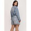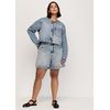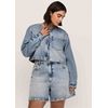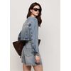 Esta jaqueta cropped é confeccionada em jeans 100% algodão sustentável, destacando-se pela sua abordagem ecológica