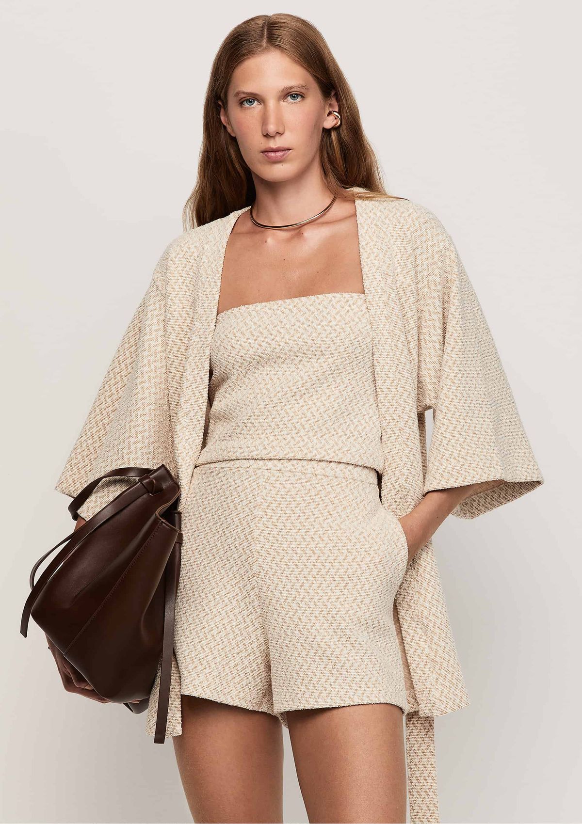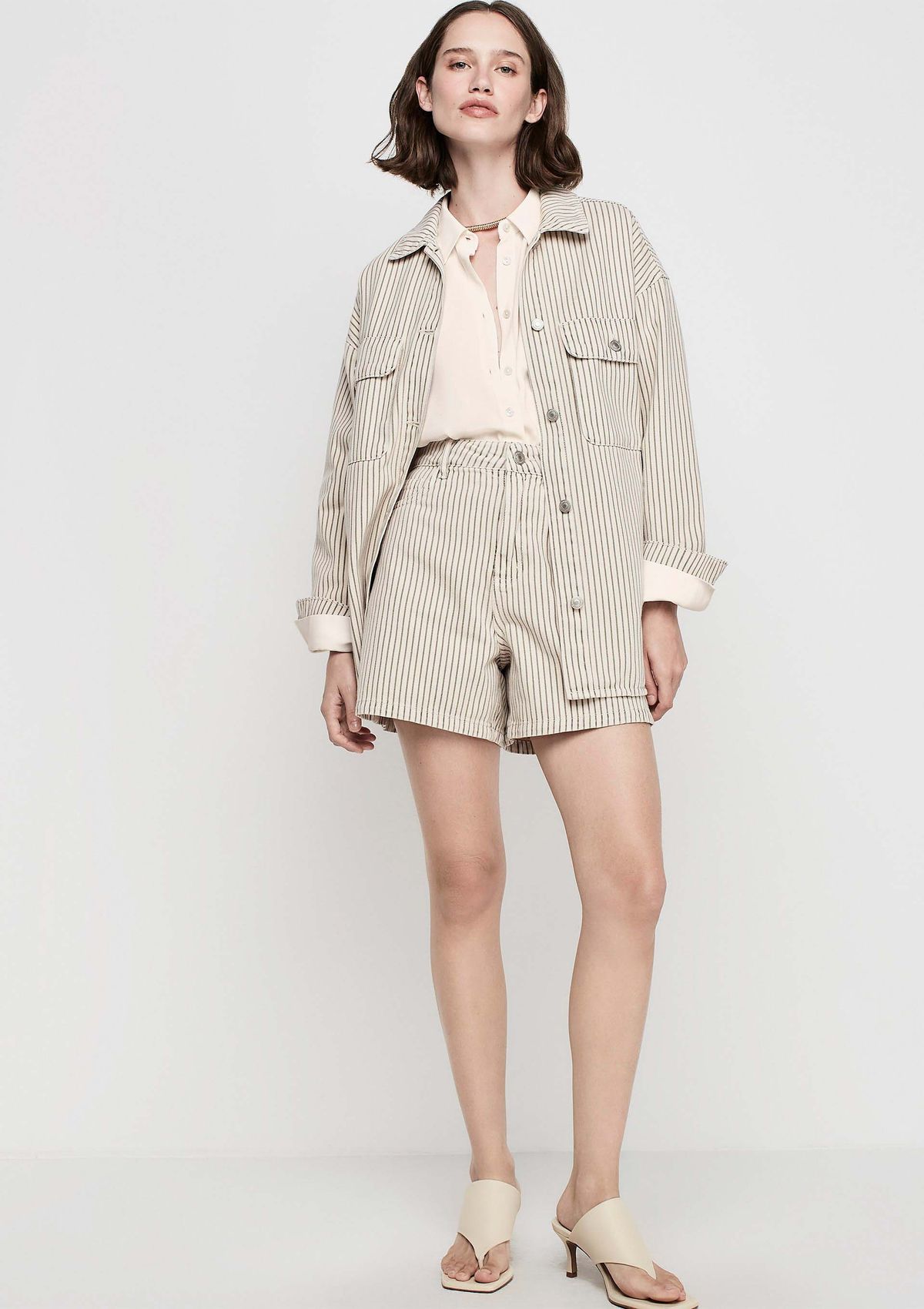 Shorts Reto Cintura Alta Em Sarja Listrado em Bege e Marrom - Estampado
