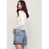 O modelo possui frente transpassada, fecho por dois botões de metal, bolso cargo nas laterais e comprimento curto.